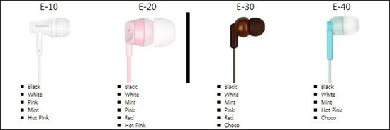 다양한 디자인과 컬러의 갖춘 인이어 스테레오 이어폰 E시리즈 4종(E-10, E-20, E-30,