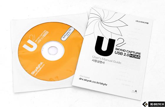 구성물로는 사용자 설명서와 USB 2.0 케이블, SKYHD 캡쳐U2.0의 출력 포트에 연결하는