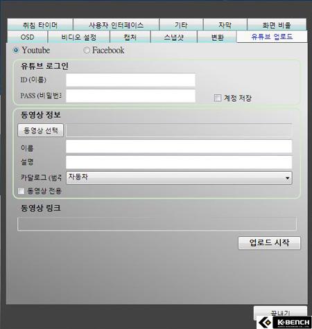 유튜브 업로드 항목에서는 녹화된 영상을 유튜브나 페이스북에 직접 등록하는