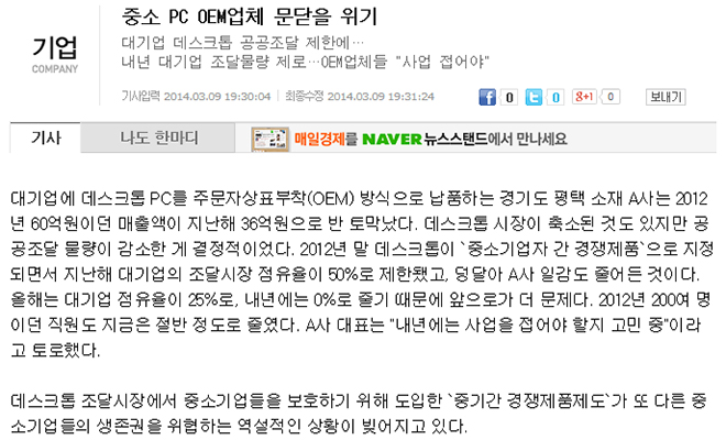 ▲ 2014년 2월 21일자로 발췌한 미디어잇 기사. 기업용 PC가