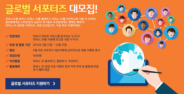 ‘글로벌 서포터즈’는 카페나 블로그 ,SNS 및 모바일 서비스를 통해 넷피스 24를 공유하는 ‘홍보왕을 찾아라’ 미션과, 넷피스24를 사용해 본 후 자유롭게 후기를 게시하는 ‘특급 유저 되자’미션, 넷피스 24를 사용해 본 후 친구한테 추천하는 ‘넷피스 24 같이 쓰자’ 등 총 3가지 미션 중 하나를 택일하여 도전할 수 있다.
