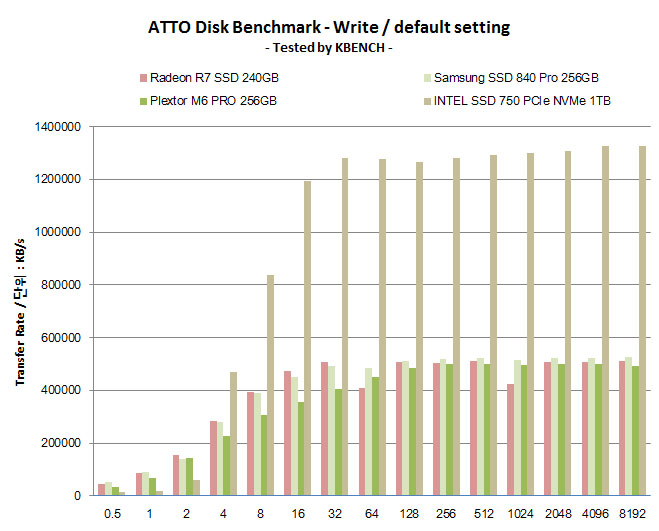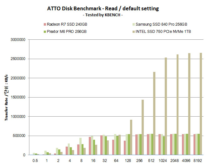 IOMeter를 이용한 순차 읽기, 쓰기 속도는 ATTO Disk Benchmark에서도 나타났다. 스토리지