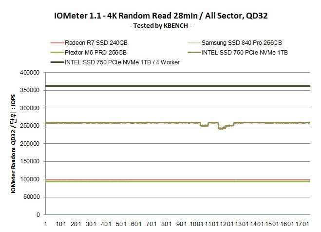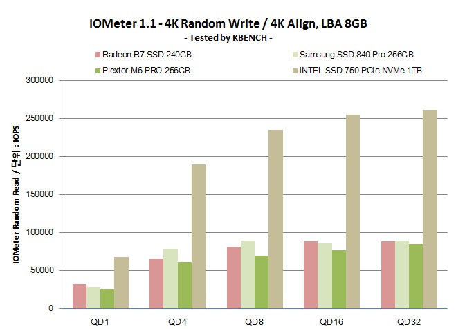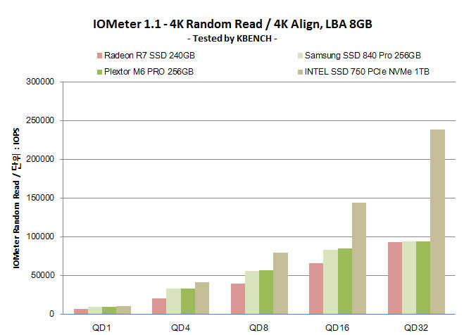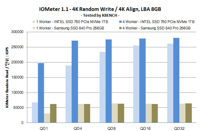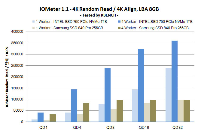 QD32 수준(4 워커, QD8)에 도달하면 더 이상의 속도 향상은 불가능해진다. 이와 달리 NVMe를 사용하는 인텔 SSD 750 1.2TB는