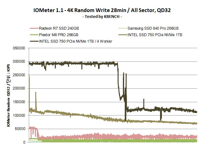 특히, 랜덤 쓰기 속도 부분에선 길어야 2~3 분이 한계인데 인텔 SSD 750 1.2TB는 급격한 속도 하락