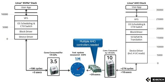 참고로, 인텔이 실험한 데이터에 따르면 NVMe는 AHCI 대비 오버헤드가 50% 이상 감소할 뿐만 아니라 AHCI로는 10개의 CPU