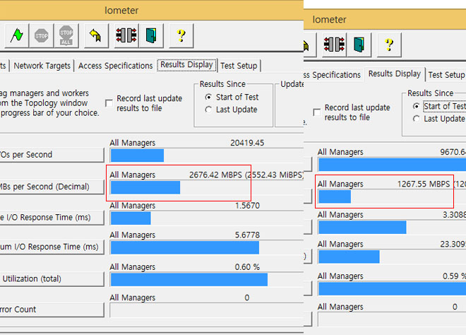 이 그래프들은 IOMeter에서 하나의 워커로 데이터를 처리하는 것과 4개의 워커로 데이터를 처리한 결과를