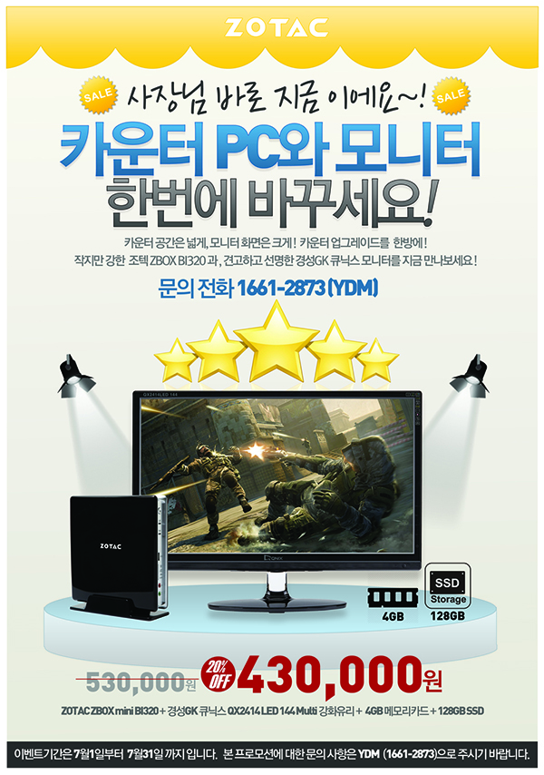 ‘카운터 업그레이드 프로모션’에서 만날 수 있는 제품은 ‘조텍 ZBOX BI320 베어본’과 ‘경성GK 큐닉스 QX2414 LED 144’ 모니터, 그리고 4GB 메모리와 128GB의 SSD까지 포함된 세트 형태로 판매된다. 하드디스크와 메모리가 포함되지 않은 베어본 제품에 메모리와 SSD까지 증정하여, 사실상 사용자는 운영체제만 설치하면 바로 사용 가능하도록 구성하였다.