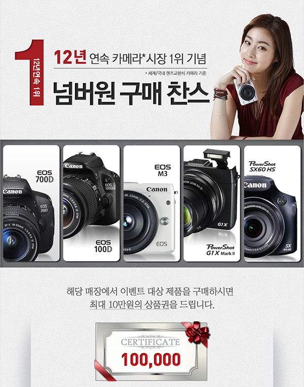 디지털 이미징 기술 선도기업 캐논코리아컨슈머이미징㈜(대표이사 강동환, www.canon-ci.co.kr)이 세계/국내 렌즈교환식 카메라 시장 12년 연속 1위를 기념해 '캐논 12년 연속 카메라 1위’ 감사 프로모션을 진행한다.