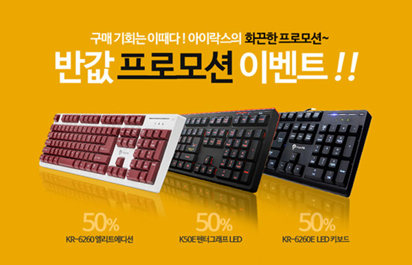 입력장치 전문 브랜드 아이락스에서 최근 출시된 특별한 컨셉 키보드 3종 제품에 대해 특별한 반값 프로모션을 진행한다고 하였다. 키캡 전체에 색다른 색(色)을 연출한 KR-6260 엘리트에디션, 펜터그래프 방십에 LED 가 적용된 K50E 펜터그래프 LED 키보드, 플런저 방식 LED 키보드 KR-6260E 키보드 3종 제품에 대해 7월중 정해진 날짜,시간,수량을 한정한 특별 프로모션 행사이다.