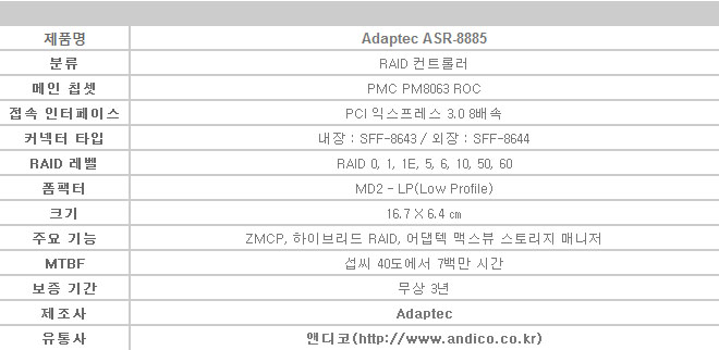 앤디코가 출시한 아답텍(Adaptec) ASR-8885는 8시리즈 RAID 컨트롤러 중 하나다.