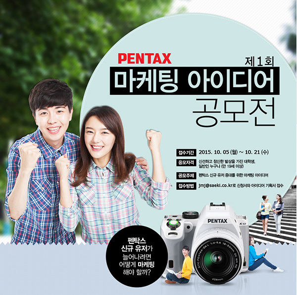 '펜탁스 신규 유저 증대'가 주제인 펜탁스 마케팅 아이디어 공모전은 대학생, 일반인 구분 없이 참신한 아이디어만 있으면 누구나 참여 가능하다. 공모전 접수는 2015년 10월 5일 (월)부터 10월 21일 (수)까지이며 1차 draft 안 접수 후 심사에 합격하면 2차 최종안으로 보강하여 제출하는 방식으로 진행된다. 1차 draft 안은 분량보다 내용에 초점을 두고 심사할 계획이기 때문에 최소 5장~최대 30장의 분량 범위만 준수한다면 자유롭게 기획안 작성이 가능해 부담 없이 도전해볼 수 있다.