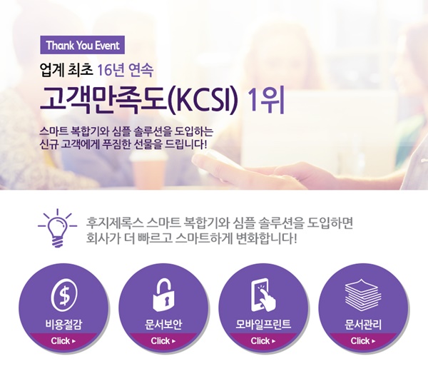 한국후지제록스가 업계 최초 16년 연속 한국산업의 고객만족도(KCSI) 1위 달성을 기념해 오는 12월 31일까지 고객 감사 이벤트를 개최한다고 11일 밝혔다.