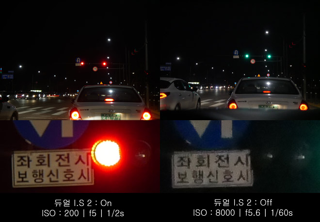 단순히 센서 시프트만 작동하는 것은 아니고 렌즈에 포함된 광학 보정 기술을 함께 활용하는 '듀얼 I.S 2'가 적용 됐다. 이 기능이 활성화