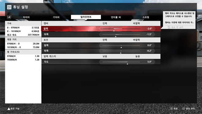 예를들어, 코너링 라인을 미리 표시하게 해두고 브레이킹을 보조지원 하게 해놓으면 라인을 타게 될시 좀더 수월한 브레이킹이 제공된다.