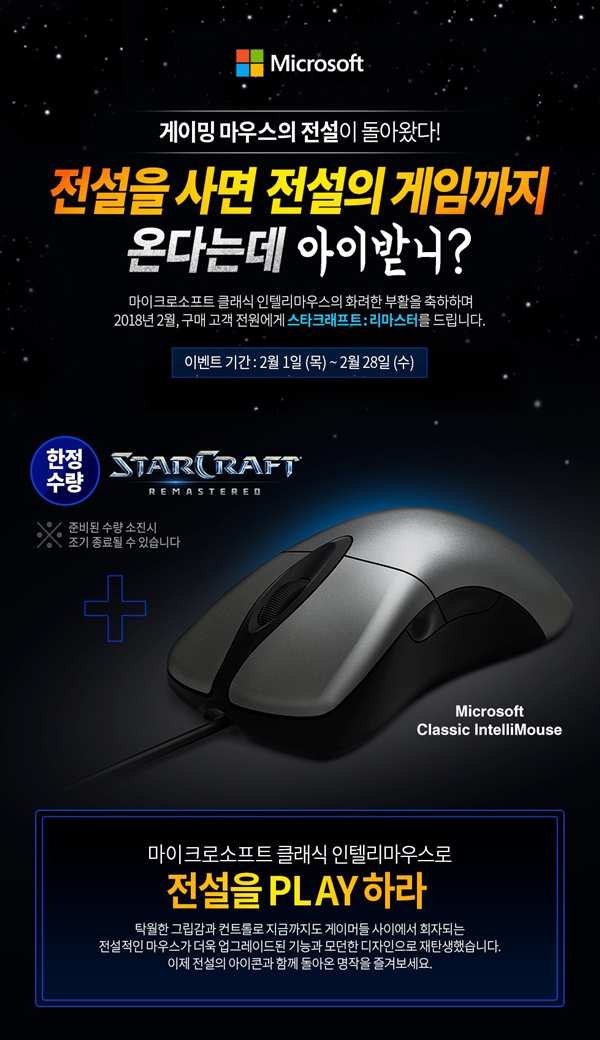 한편, 마이크로소프트는 신제품 출시를 기념해 2월 한 달간 지마켓에서 ‘마이크로소프트 클래식 인텔리마우스’ 기획전을 진행한다. 기간 내 마이크로소프트 클래식 인텔리마우스를 구매하는 고객에게는 다시 돌아온 전설의 게임 ‘스타크래프트:리마스터’가 증정된다. 단, 한정수량 소진 시 조기 마감될 수 있다.