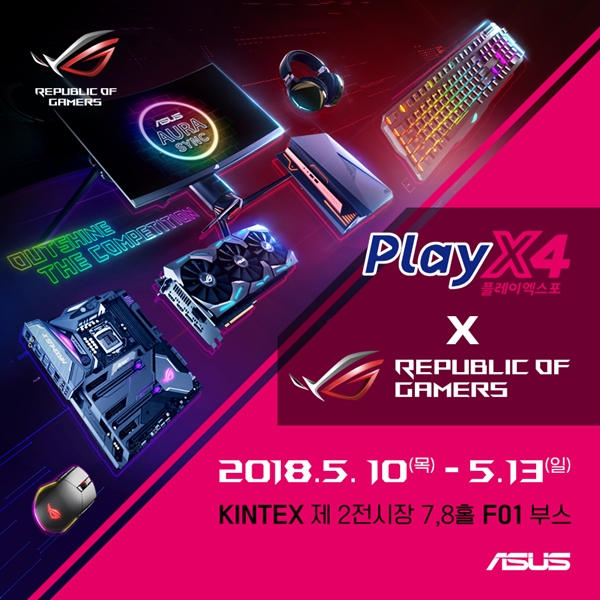 에이수스 코리아는 5월 10일부터 13일까지 일산 킨텍스 제2전시장에서 진행되는 2018년 상반기 최대 게임쇼인 ‘2018 PlayX4(플레이엑스포)’에 참가한다고 밝혔다.