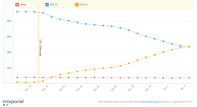 지난달 18일 출시된 iOS 12는 48시간 동안 고작 10%를 웃도는