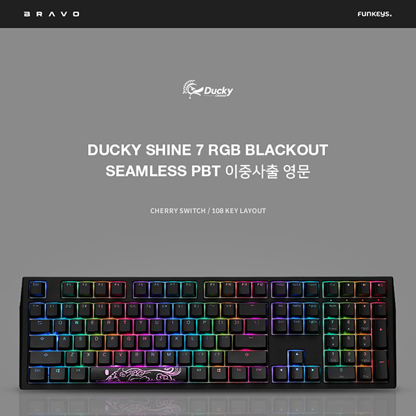 브라보텍의 자사 브랜드인 FUNKEYS에서 DUCKY SHINE 7 RGB BLACKOUT SEAMLESS PBT 이중사출 영문 모델의 출시 소식을 알렸다.