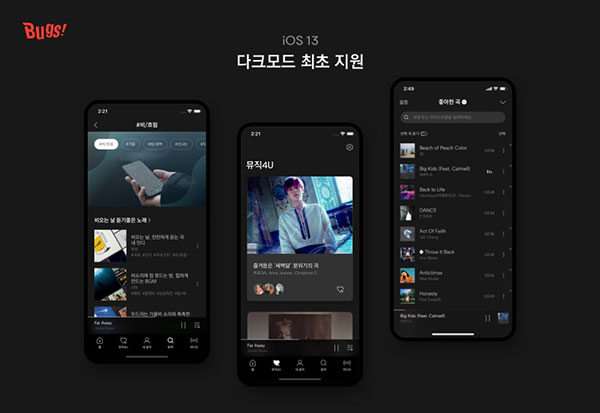 애플은 지난달 새로운 운영체제(OS)인 iOS 13을 배포하며 다크모드를 선보인 바 있다. 벅스는 15일 iOS 버전 앱 업데이트를 통해 음원 업체 최초로 애플의 다크모드를 정식 도입했다. 아이폰이나 아이패드 기기 설정 메뉴에서 다크모드를 선택할 경우 벅스 앱도 자동으로 적용된다.