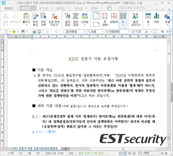 실제로 메일에는 'KINU 전문가 자문 요청사항(한미동맹과 한중관계).hwp'라는 악성 한글 문서 파일이 첨부되어 있다.