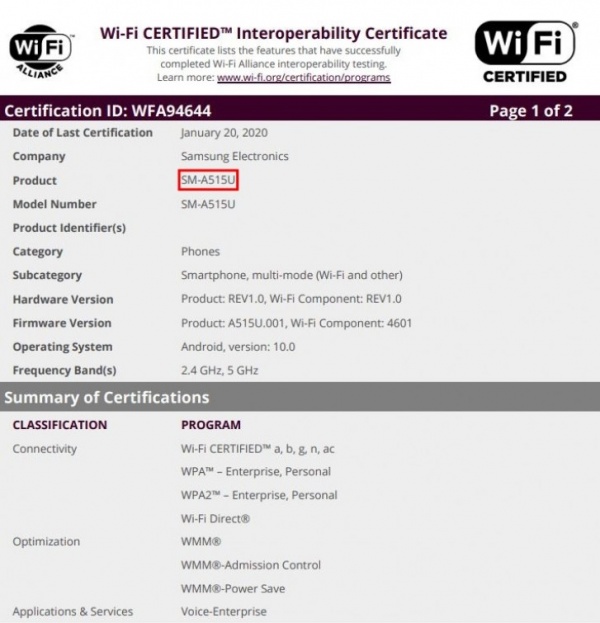 갤럭시 A51이 최근 와이파이 인증을 통과한 것으로 확인됐다.