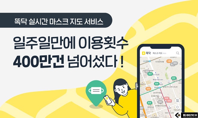 똑닥을 운영하는 비브로스는 신종 코로나 바이러스(코로나19) 확산에 대응하기 위해 선보인 똑닥 실시간 마스크 지도 서비스의 이용 횟수가