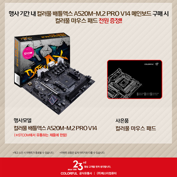 컬러풀 배틀액스 A520M-M.2 PRO V14 STCOM 메인보드 구매 시 한정판 컬러풀 마우스 패드 증정 이벤트는 2021년 1월 11일부터 2월 11일까지 컴퓨존, 조이젠, 아이코다, 가이드컴, 피씨포올, 컴퓨터코리아 등 주요 온라인 컴퓨팅 관련 전문 쇼핑몰에서 진행되며, 사은품 재고 소진 시 행사는 조기 종료될 수 있다.
