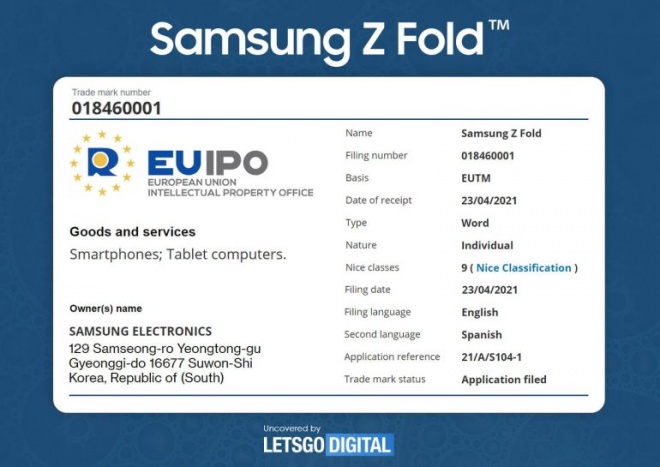 26일(한국시간) 외신은 네덜란드 렛츠고디지털을 인용해 삼성전자가 유럽지식재산청(EUIPO)에 '삼성 Z 폴드' 상표를 출원했다고 보도했다.