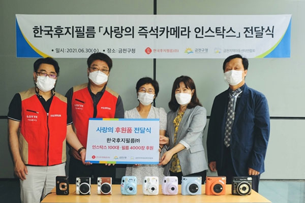 한국후지필름이 서울 금천구청과 연계하여 금천지역아동센터 연합회에 인스탁스 즉석카메라 100대와 필름 4,000장을 기부하고 지난 30일 전달식을 가졌다.