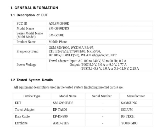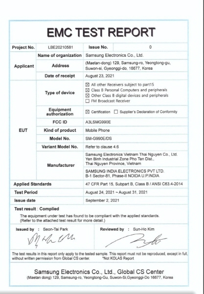 인증 문서에 따르면 인증을 통과한 갤럭시S21 FE(모델 번호 SM-G990E)는