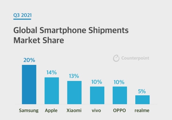 삼성전자는 20% 시장 점유율로 1위를 차지했다. 삼성전자의 3분기