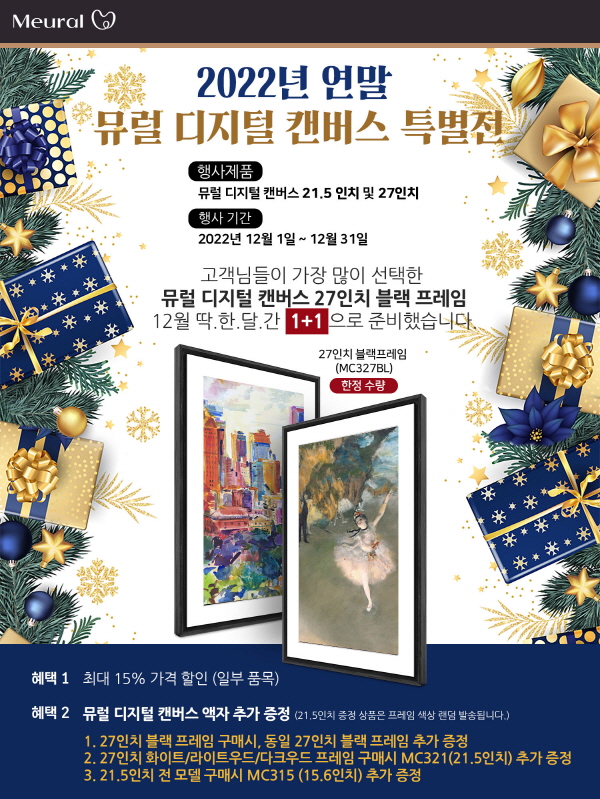 27인치 블랙 프레임(MC327BL)의 뮤럴 디지털 캔버스 구매 시 동일한 색상의 27인치를 한 대 더 증정하는 1+1 프로모션을 진행한다. 구매가격은 1,500,000원으로 1대당 750,000원에 구입하는 것과 마찬가지로 연말을 맞아 특별한 선물로도 활용도가 높다. 지금까지 가장 많은 고객들이 선호했던 뮤럴 디지털 액자는 27인치 블랙 색상으로 다양한 인테리어에도 무난하게 어울린다. 블랙 색상을 제외한 27인치(화이트,라이트우드,다크우드) 디지털 액자 구매 시에는 21.5인치 디지털 캔버스를 무료로 증정하고 5~10% 추가 할인도 진행한다. 21.5인치 뮤럴 캔버스 구매 고객은 최대 15% 할인된 926,500원에 구매가 가능하고, 15.6인치(69만 원 상당) 디지털 액자를 무료로 증정한다.