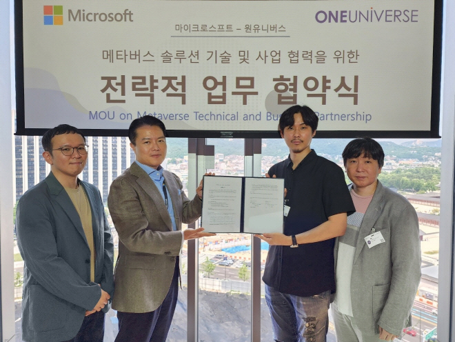 메타버스 전문 개발사 원유니버스는 한국마이크로소프트와 메타버스 솔루션 기술 협력에 대한 업무협약을 체결했다고 5일 밝혔다. 서울 광화문에 위치한 한국마이크로소프트 사옥에서 진행된 이번 협약식에는 고세준 원유니버스 대표이사, 고광범 한국마이크로소프트 엔터프라이즈 커머셜 사업 부문장 등 양사 핵심 경영진이 참석했다.