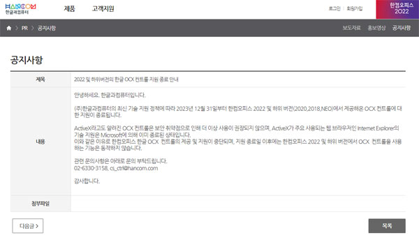 한컴은 지난 2000년 한글 OCX 기술을 공개한 이후 지금까지 한국인터넷진흥원(KISA)과 함께 알려지지 않은 소프트웨어 취약점을 악용한 보안 위협 등이 발생하지 않도록 지속적인 대응을 이어왔으나, 웹 표준화 기술로 전환하기 위해 23년 만에 기술 지원 종료를 결정했다고 설명했다.