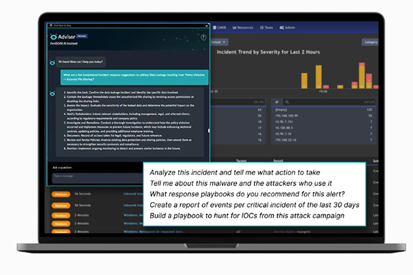 포티넷은10년 이상 AI를 통해 포티넷 보안 패브릭(Fortinet Security Fabric)과 포티가드랩 위협 인텔리전스 및 보안 서비스(FortiGuard Labs threat intelligence and security services)를 혁신해왔으며, 최근 화두가 되고 있는 생성형 AI(GenAI)를 접목해 고객들을 보호하고 고객의 비즈니스 운영이 온라인에서 안전하게 영위될 수 있도록 지원하게 되었다. 포티넷 어드바이저(Fortinet Advisor) 이니셜 릴리스는 보안 운영(SecOps) 팀이 신속하게 위협을 조사하고 교정할 수 있도록 지원한다.