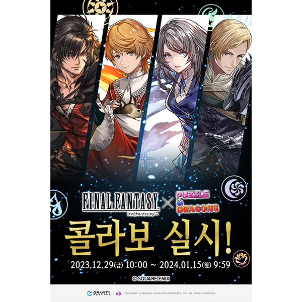 겅호 온라인 엔터테인먼트가 개발하고 모바일 콘텐츠 전문 기업인 그라비티 네오싸이언이 서비스하는 모바일 퍼즐 게임 퍼즐앤드래곤이 FINAL FANTASY, CRYSTAL DEFENDERS와 콜라보레이션 이벤트를 29일부터 실시한다.