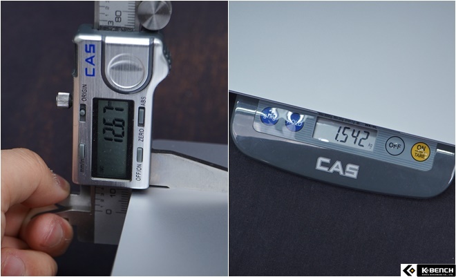 사이즈, 스펙표기상 12.5mm의 두께감을 가지고 있다. 무게는 1.56kg 수준으로, 오차가 있을 순 있지만 미세하다.