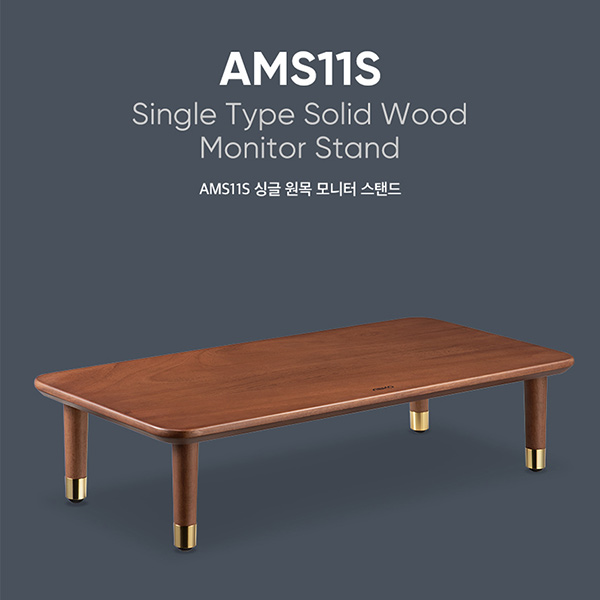 AMS11S는 마호가니 목재에 페인트 코팅을 더해 아름다운 나무결과 부드러운 질감으로 고급스러운 느낌을 자아내는 원목 모니터 받침대이다. 다리는 황동 소재로 마감하여 한 층 더 모던한 느낌을 준다. 상판의 마호가니 원목은 내구성이 뛰어나고 무게는 가벼우며 매력적인 원목 색상을 가진 것이 큰 특징이다. 다리는 너도밤나무 소재로 제작되어 최대 하중을 20kg까지 견딜 수 있다.