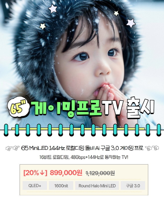 65 MiniLED 144Hz 로컬디밍 돌비 Ai 구글 3.0 게이밍 프로는 144Hz패널을 장착해, 최근 판매가 늘고 있는 144Hz 콘솔 및 FPS게임에 최적화한 제품이다. 1600칸델라의 높은 밝기를 갖춰 HDR 적용 시 OLED 못지않은 화려한 색감을 감상할 수 있다. 퀀텀닷+ 기술을 적용한 패널은 10억 개 이상의 색상 음영을 제공해 자연에 가까운 색표현을 보여준다. Wide Color Gamut 기술을 통해 색 재현율을 극대화했다. Round Halo MiniLED를 적용해 LED 간의 빛의 간섭을 최소화했다.