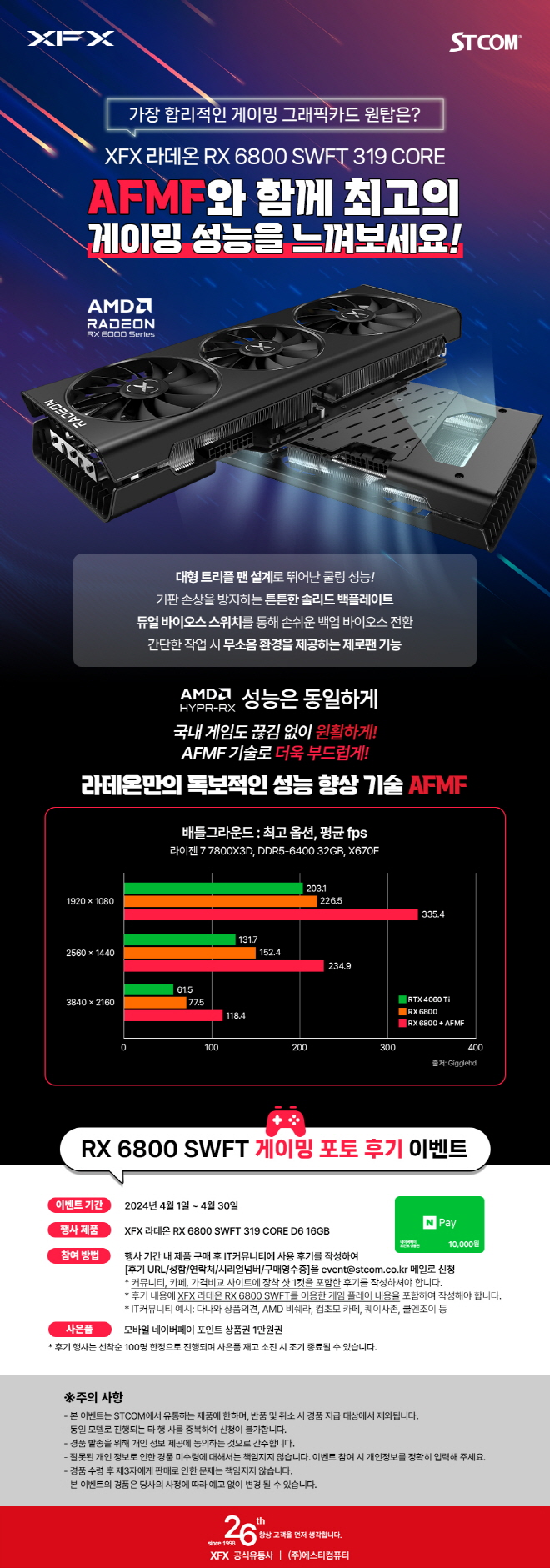 1998년 설립되어 20년 이상 컴퓨팅 관련 솔루션을 유통해온 전문 유통사인 (주)에스티컴퓨터 (대표: 서희문, 이하 STCOM)는 합리적인 게이밍 그래픽카드 원탑인 XFX 라데온 RX6800 SWFT 319 CORE D6 16GB 그래픽카드에 대한 게이밍 사용기 작성 행사를 진행한다.