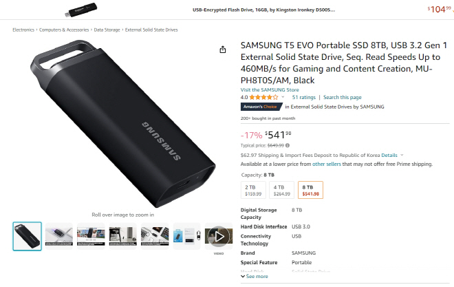 'T5 EVO'를 108.01달러가 할인된 541.98달러에 판매하고 있다. 외신은 아마존의 판매