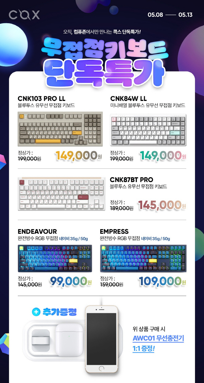 5월 8일부터 13일까지 진행되는 이번 단독 특가를 통해 COX의 무접점 키보드를 최대 32% 할인된 가격에 만나볼 수 있다. 이번 행사에는 CNK103 PRO LL, CNK84W LL, CNK87BT PRO, 엔데버, 엠프리스가 포함되었다.