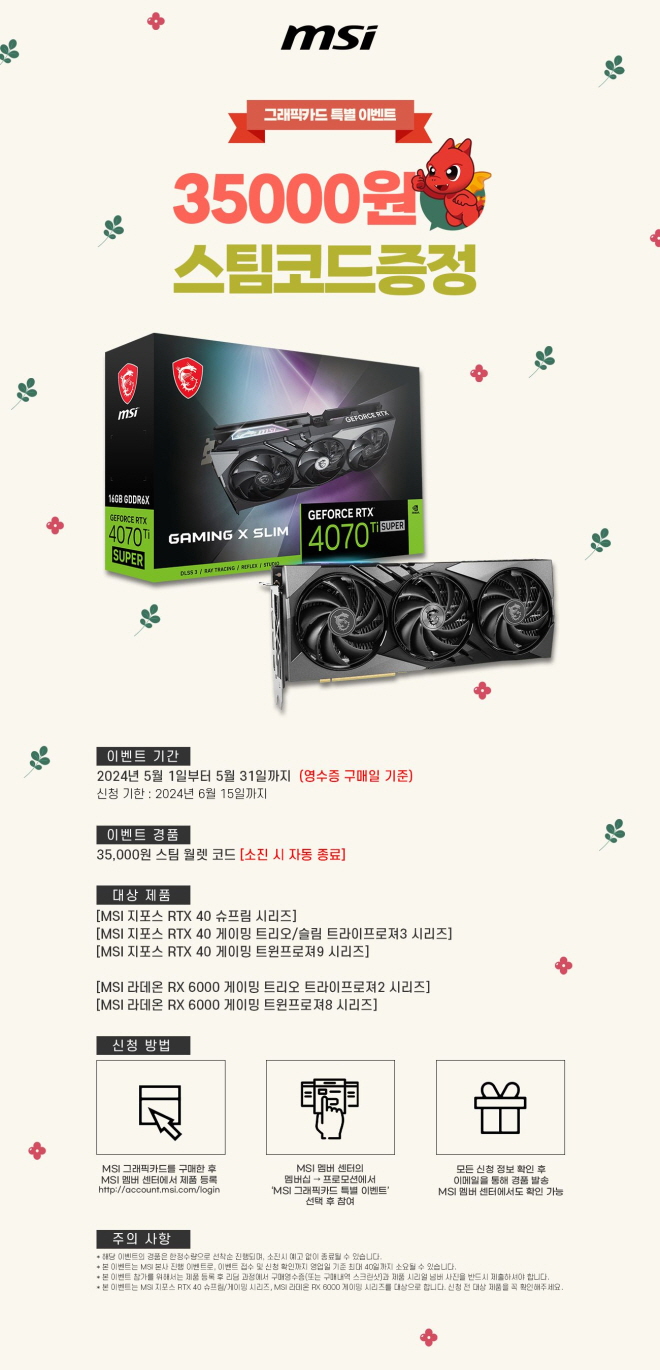 엠에스아이코리아(대표 공번서)가 5월 한 달간 자사의 그래픽카드를 구매한 고객들에게 스팀 월렛 35,000원 코드를 증정하는 행사를 진행한다고 밝혔다.