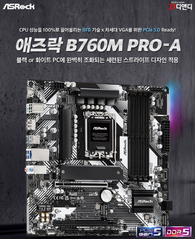 혁신적인 기술로 글로벌 PC DIY 마켓을 리딩하는 애즈락(ASRock) 메인보드, 그래픽카드 유통사 디앤디컴(대표: 여인우, 이하 디앤디)은 Dr.MOS 7+1+1 전원부와 PCIe Gen5 그래픽카드 스틸슬롯, 그리고 3개의 M.2 NVMe 슬롯을 지원하는 B760 라인업의 새로운 에이스, 애즈락 B760M PRO-A를 공식 출시한다.
