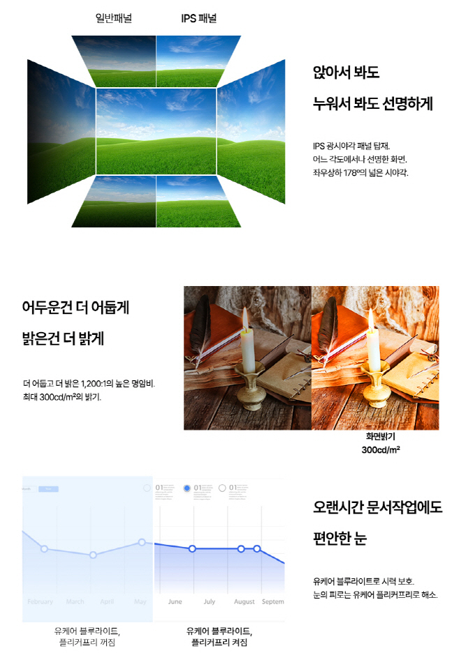 미세한 깜박임 없는 플리커프리 기능과 청광 차단 기능인 유케어 블루라이트가 적용되어 있어, 장시간 모니터 사용에도 눈의 피