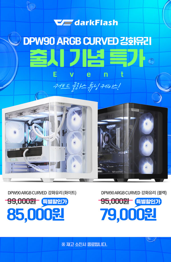 다크플래쉬는 이번 신제품인 DPW90 케이스에 처음으로 커브드 강화유리 디자인을 채택했다. 전면부터 좌측면이 모두 강화유리로 구성된 어항 케이스 형태에 커브드 디자인을 적용하여 보다 깔끔하고 아름답다. 특히, PC 내부의 부품을 한눈에 볼 수 있어 사용자의 취향을 담은 시스템을 꾸밀 수 있다.