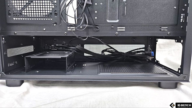 파워 수납부 역시 보다 넓은 느낌을 받을 수 있다. 하드디스크 및 2.5인치 SSD 수납이 가능한 멀티 브라켓을 사용해도 280mm 수준의