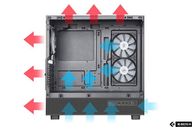 내부 공간 특징을 살펴보기 전에, DPX90 ARGB 케이스의 팬의 위치에 따른 공기 흐름을 살펴볼까 한다.