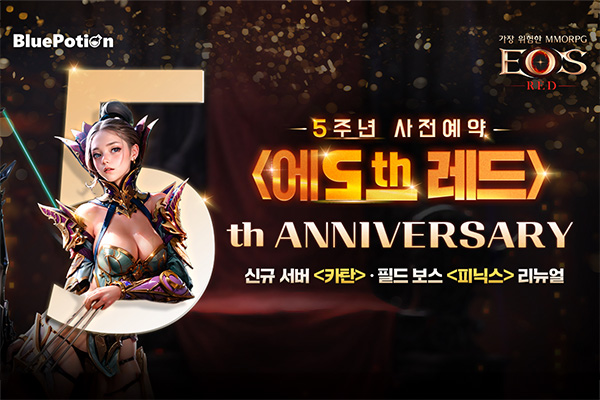 블루포션게임즈(대표 정재목, 조승진)는 직접 개발하고 서비스하는 모바일 정통 MMORPG 에오스 레드가 론칭 5주년을 맞이하여 사전예약 이벤트를 시작한다고 4일 밝혔다.