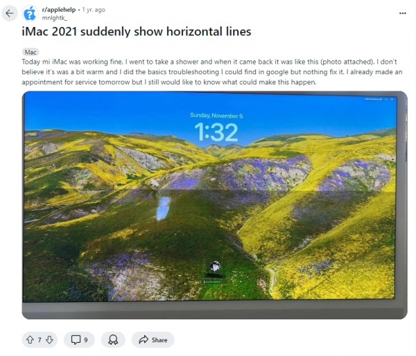 점을 감안할 때, 2021년 5월에 출시된 특정 아이맥 모델의 하드웨어 문제일 수 있다"고